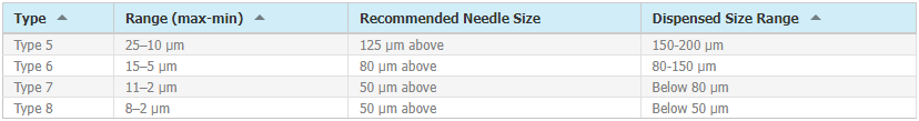 u 针头内径至少是焊料颗粒大小的五倍才能有效避免出现堵塞问题。常见的锡膏颗粒大小和针头大小关系如下: