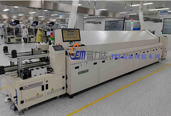 下图为惠伦晶体重庆分公司TXS晶振烤胶事业部自动上下料机+固化双轨回流(拍摄照片经由客户同意)