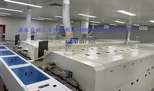 下图为惠伦晶体重庆分公司自动测试+老化线,实际模拟晶振产品在经过自动上板进入三次香蕉视频下载污烘烤后产品是否存在可靠性问题,并经由视觉扫码分选进入后端48H和96H老化炉,出口自动收板,达到客户晶振每月产能60000K(拍摄照片经由客户同意)